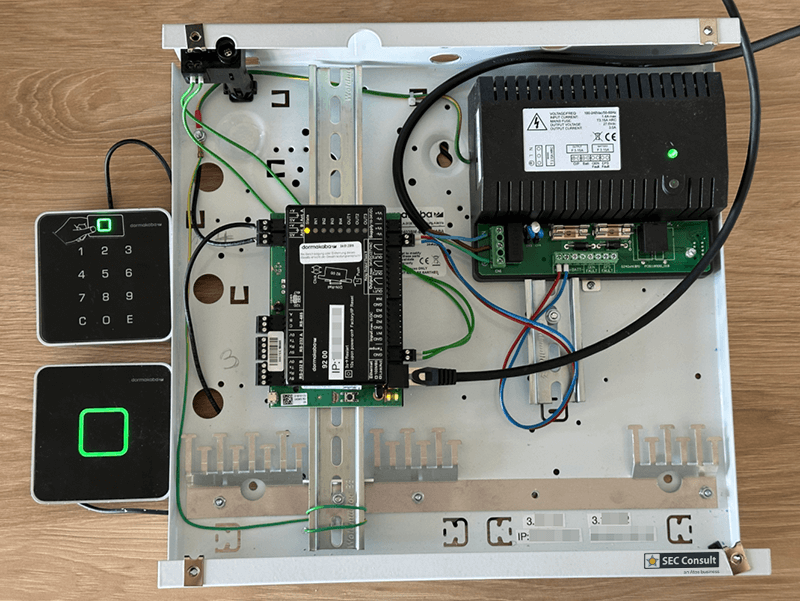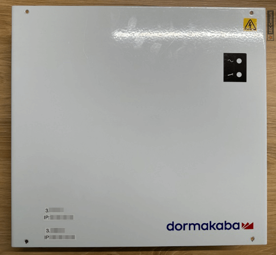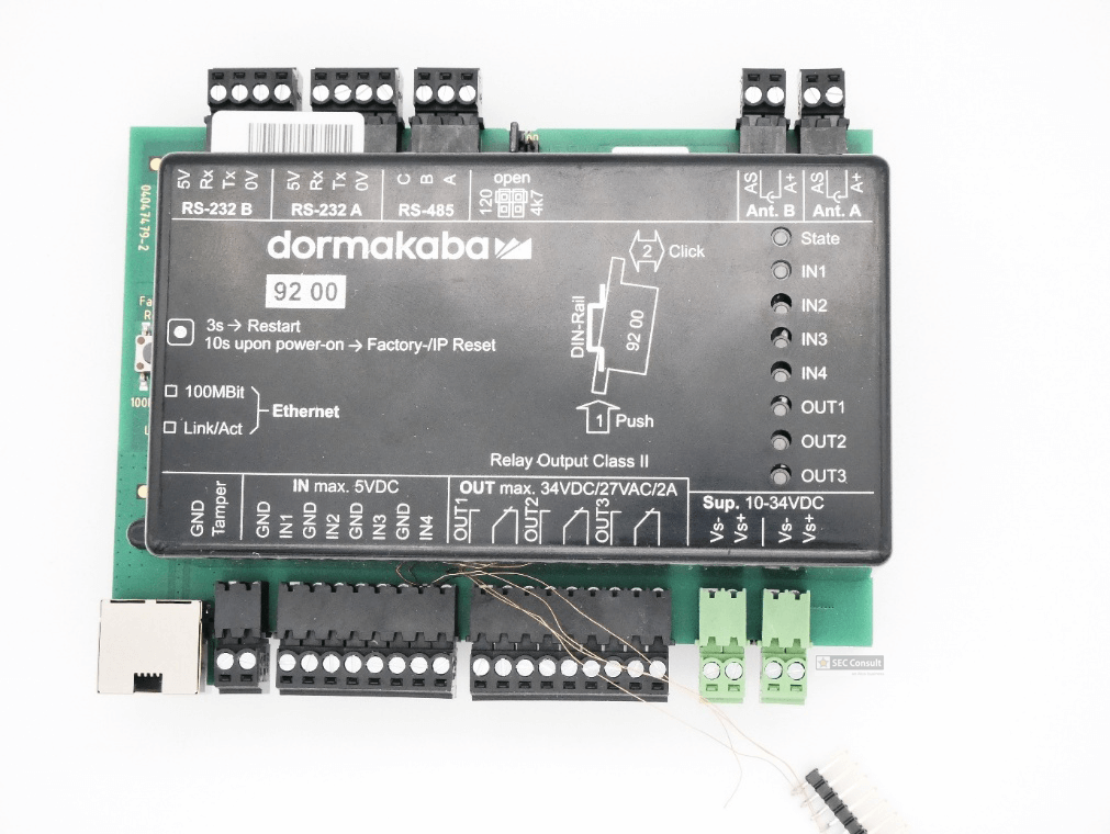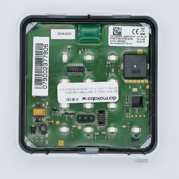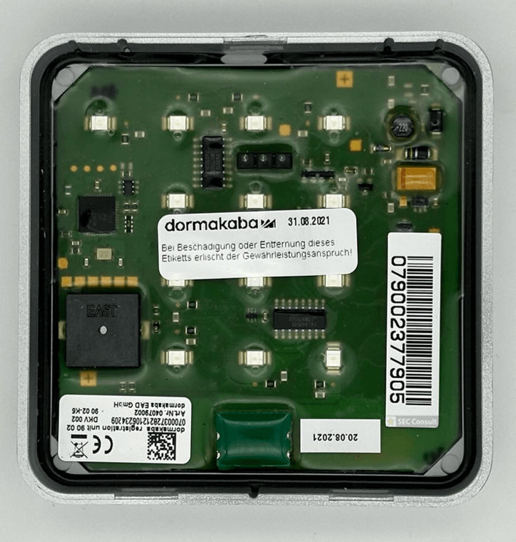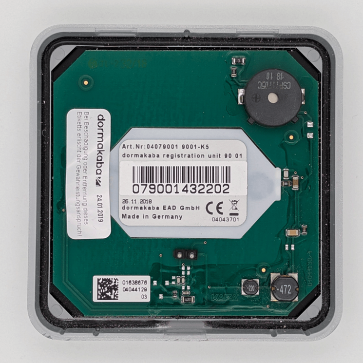 Another element in scope of our research included the dormakaba registration unit 90 02. This registration unit is equipped with an RFID card reader and a PIN pad. The communication takes place via coax. The PIN pad can be easily detached by everyone with physical access, due to the quick release system used by dormakaba. An attacker can simply pull the device off the wall without any tools needed. After doing that, the attacker is presented with the following beautiful backside (see figure 33).