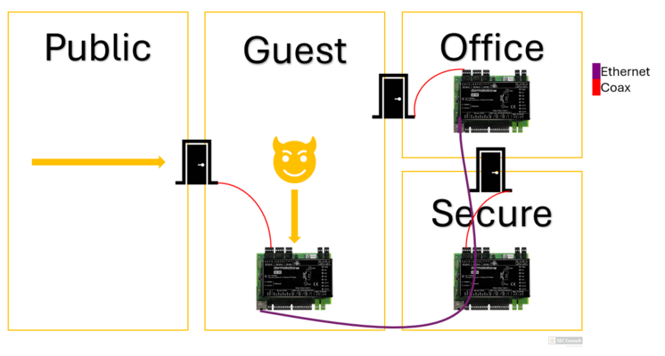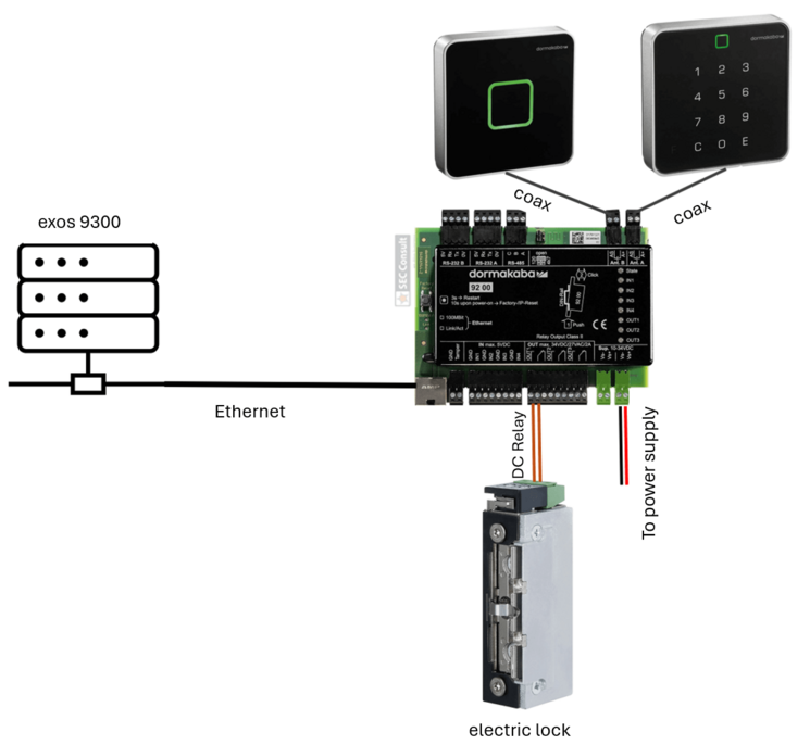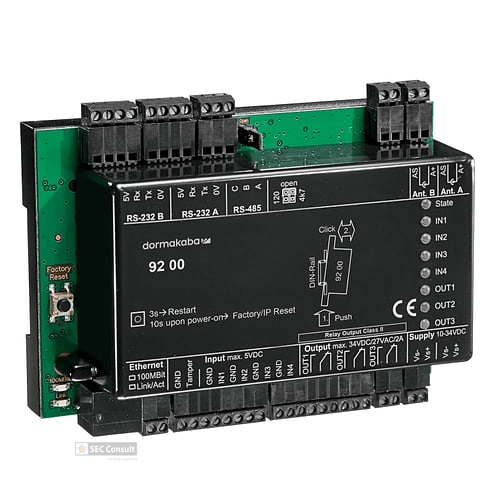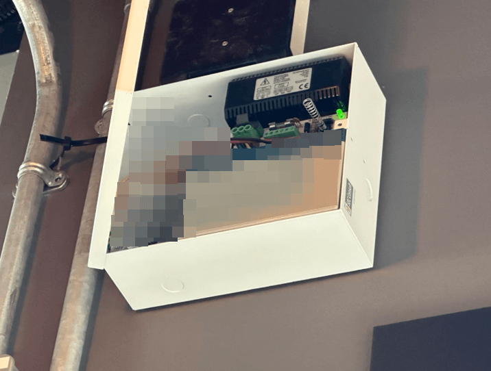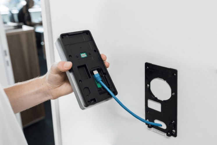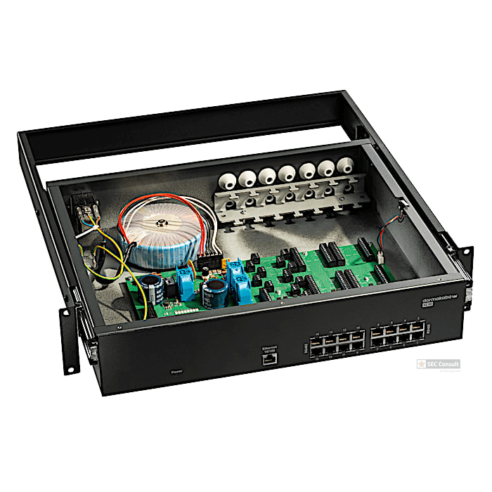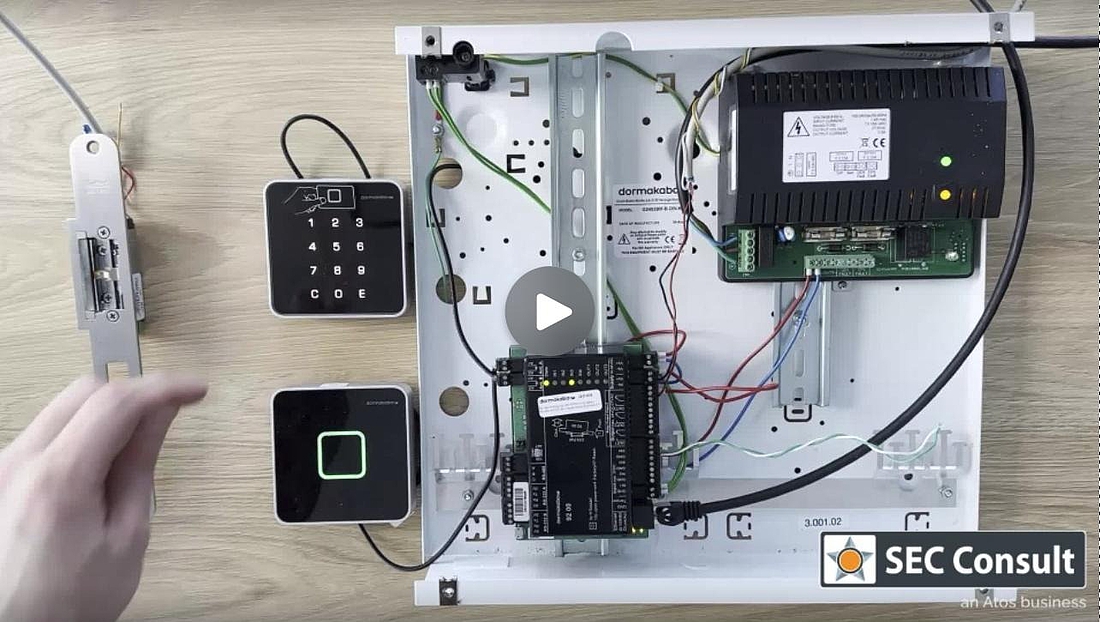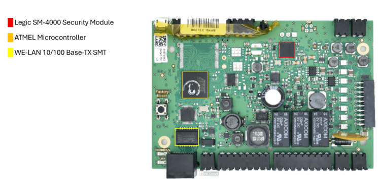 Another element in scope of our research included the dormakaba registration unit 90 02. This registration unit is equipped with an RFID card reader and a PIN pad. The communication takes place via coax. The PIN pad can be easily detached by everyone with physical access, due to the quick release system used by dormakaba. An attacker can simply pull the device off the wall without any tools needed. After doing that, the attacker is presented with the following beautiful backside (see figure 33).