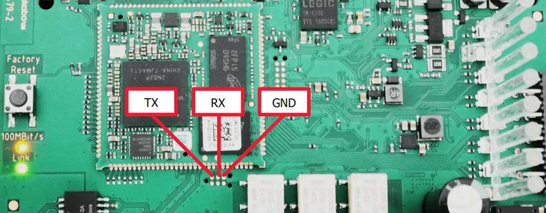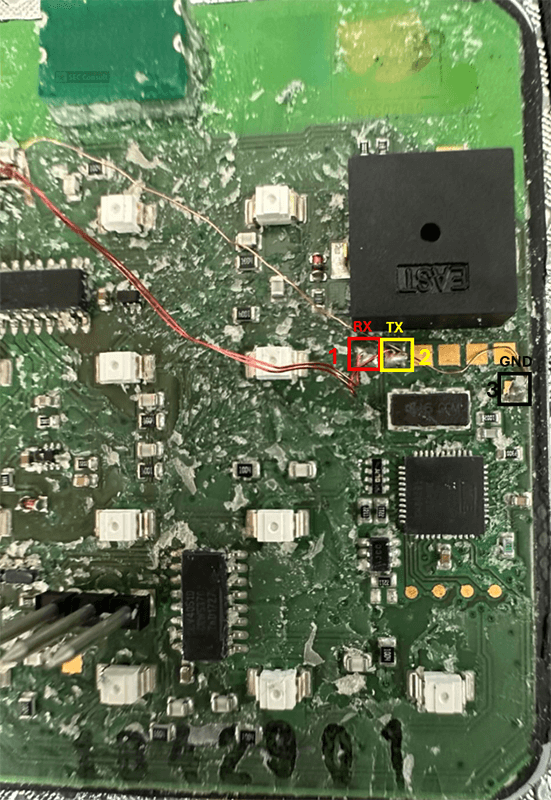 The beautiful back is now gone for good, as we are finally able to access the soldering pads. After using the multi meter and a little bit of trial and error we identified UART connector pins. The configuration looks as shown in figure 34.