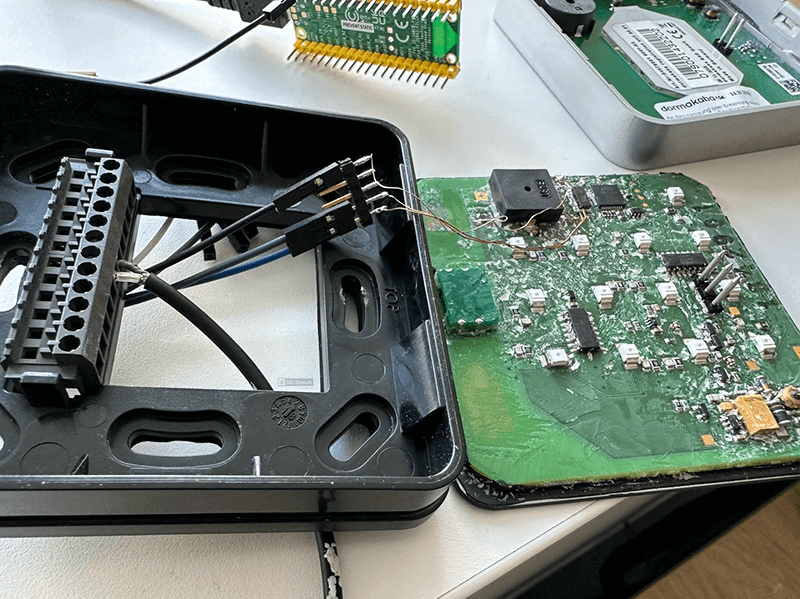 As can be clearly seen the UART is spitting out the entered PINs. This is not a super critical issue but could be used in combination with a hardware implant to exfiltrate PINs. To demonstrate this, we used a Raspberry Pi Pico as an implant that fits perfectly into the backside of the PIN pad. The first demo setup can be seen in figure 35.