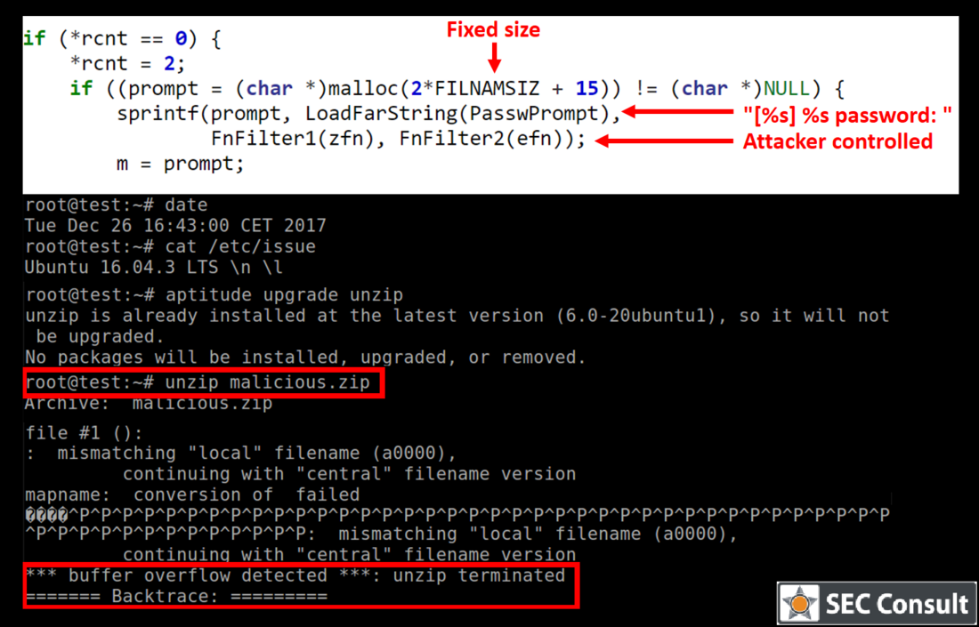 InfoZip’s UnZip suffers from a heap-based buffer overflow when uncompressing password protected ZIP archives. An attacker can exploit this vulnerability to overwrite heap chunks to get arbitrary code execution on the target system.